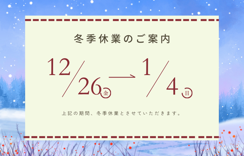 【冬季休暇のお知らせ】12月26日㈮午後~2026年1月4日㈰までお休みです。1月5日㈪より通常営業です!詳細 Winter Holidaysdetail